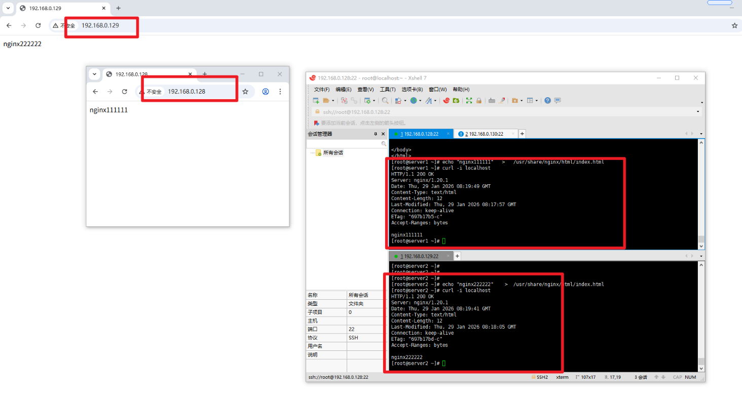 # 示例:Server1主页写“nginx111111”,Server2写“nginx222222”