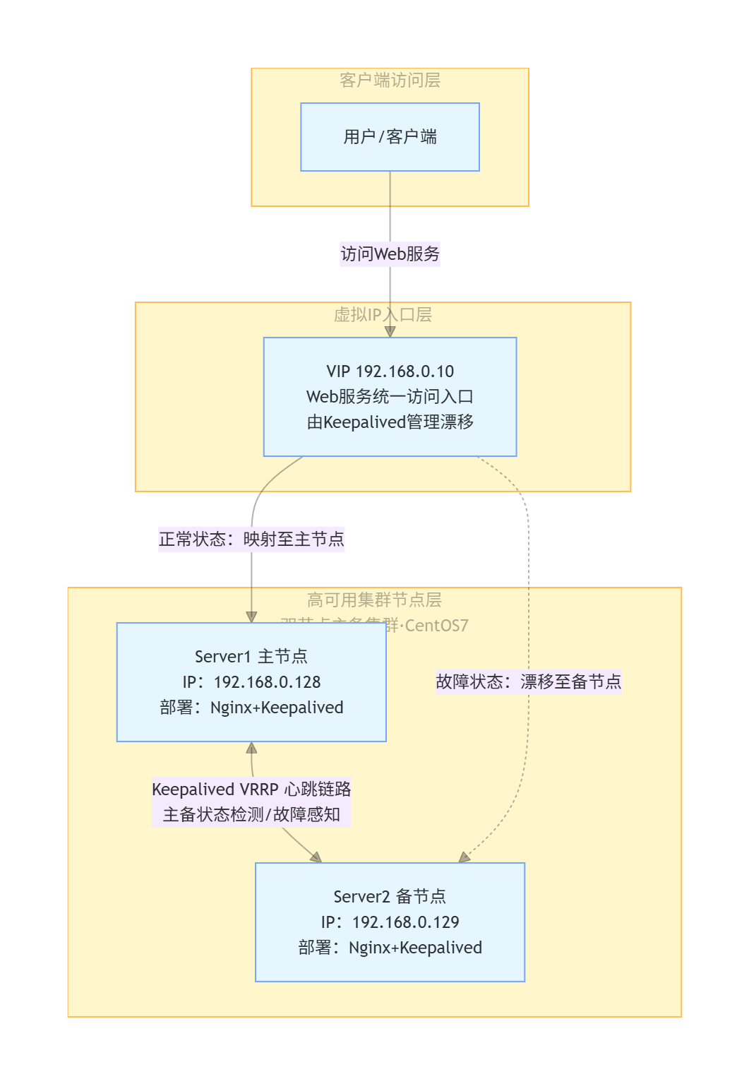 理论结合实践,本案例将搭建“Keepalived+Nginx”主备集群,实现Web服务的高可用——当主节点Nginx故障或节点宕机时,备节点自动接管服务,保障用户访问不中断。