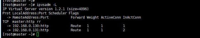 验证LVS规则:在Master节点执行 ipvsadm -L,可查看LVS转发规则,显示后端两个Web节点(RS1、RS2)状态为“ACTIVE”,说明规则生效。