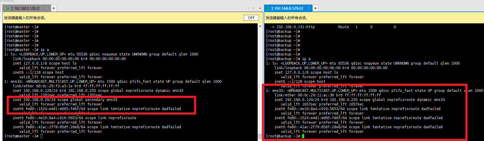 验证VIP位置:在Master节点执行ip a,可看到VIP(192.168.0.20)绑定在ens33网卡上;备节点无VIP,符合主备逻辑。
