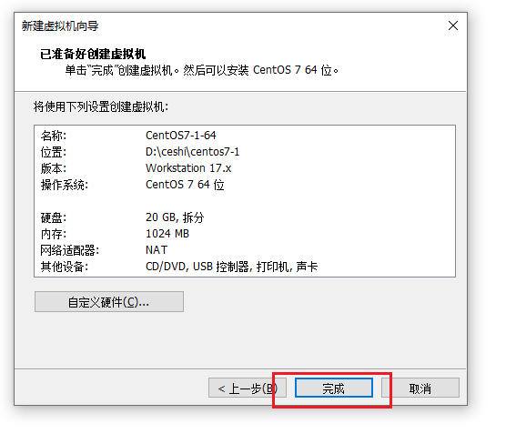 「位置」:选择虚拟机文件的存放路径,示例:D:\ceshi\centos7-1