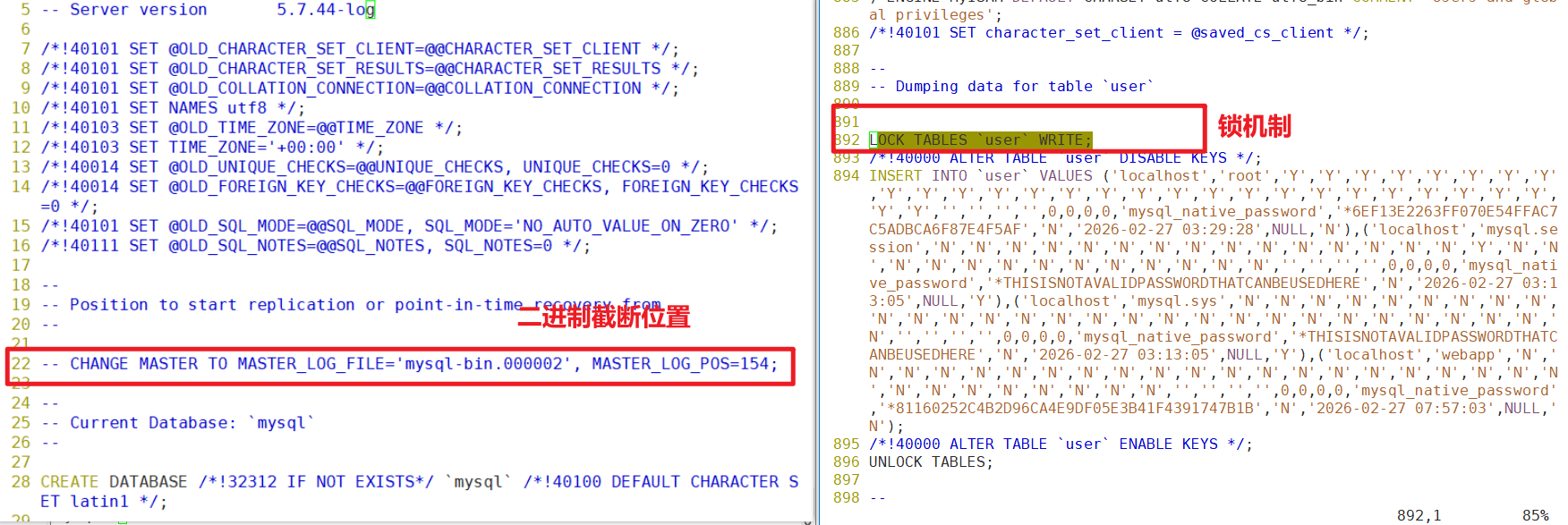 userWRITE; ——观察各种锁机制,用来保证数据一致性 - CHANGE MASTER TO MASTER_LOG_FILE=’mysql-bin.000002′, MASTER_LOG_POS=154; ——二进制日志截断位置。第22行
