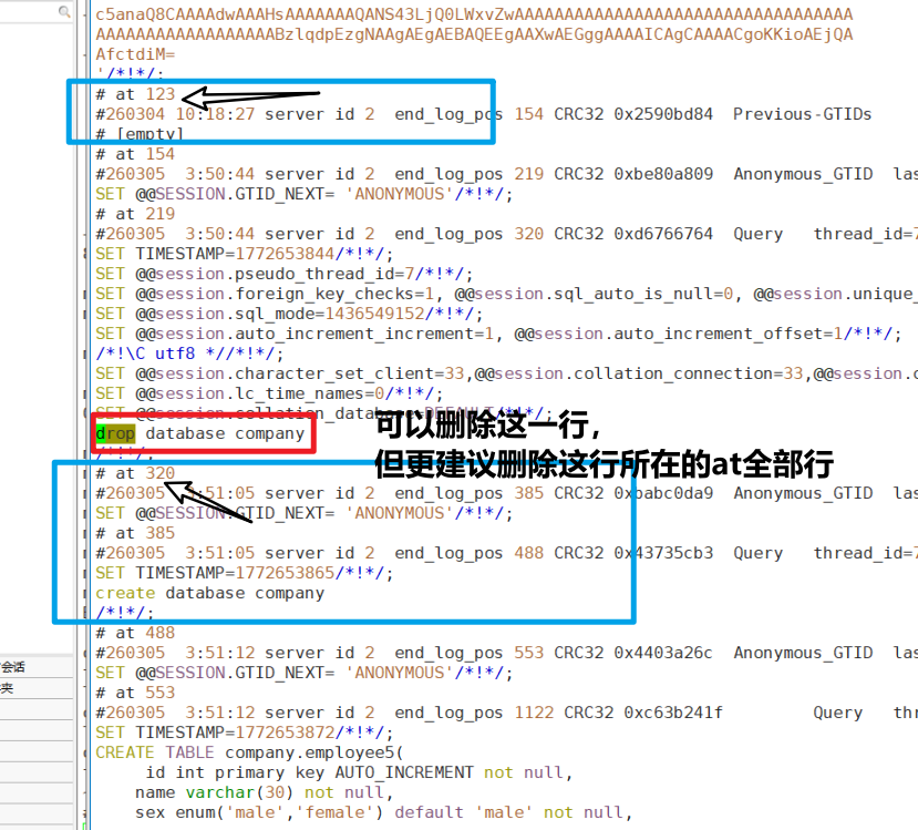 at事务块为单位(如截图中# at 123、# at 154等),每个at块对应一组关联的数据库操作。若误操作语句归属于at 219,需从at 219起始位置到下一个at块(如at 320)前的所有内容一并删除。 - 典型场景:若误操作是
